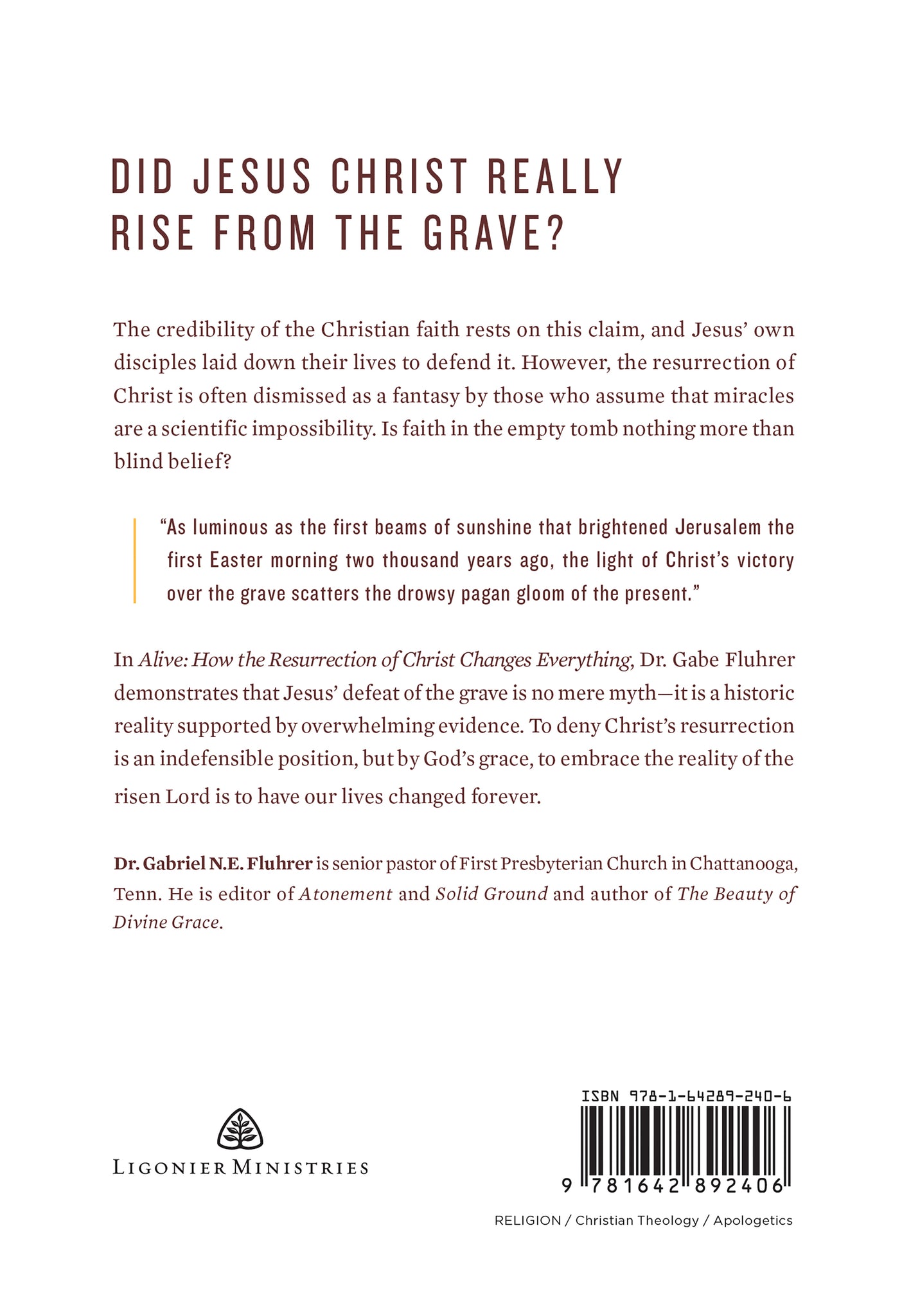 “If Christ is not raised from the dead, then our faith is worthless (1 Cor. 15:14). However, Christ is risen and lives today! Surprisingly, few good books have been written on the vital subject of Christ’s resurrection, so Dr. Gabe Fluhrer’s work is all the more welcome. This gripping, well-written book argues from the Holy Scriptures and from careful reasoning that Christ’s resurrection is both true history and the ground of our hope both objectively and subjectively.”